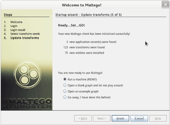 (6)在该界面选择怎样使用Maltego,这里选择默认的选项Run a machine(NEW!!)。然后单击Finish按钮,将显示如图4.15所示的界面。