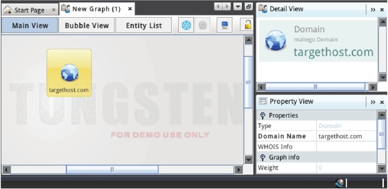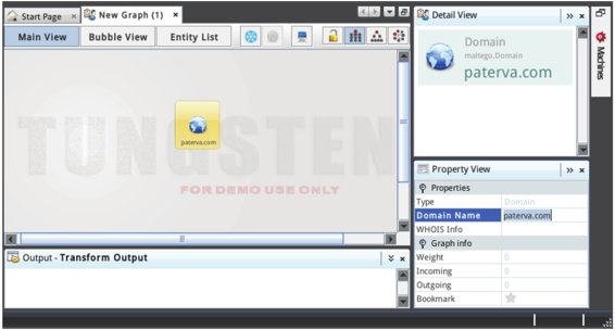 (10)该界面显示了刚创建的paterva.com。如果没显示,在右侧栏Palette下选择Domain,然后用鼠标拖拽域名到Graph中。在该界面选择paterva.com域名,将会在右侧栏显示paterva.com域名的相关信息,如图4.19所示。该域名的信息可以修改,如修改域名。单击Property View框中的Domain Name,将鼠标选中当前的域名就可以修改。例如,将这里的域名paterva.com修改为targethost.com,将显示如图4.20所示的界面。