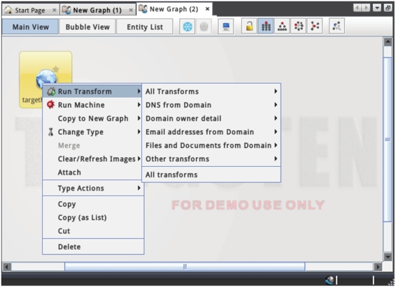 (11)一旦目标主机设置成功后,用户就可以启动收集信息。首先右击创建的域实体,并选择Run Transform将显示有效的选项,如图4.21所示。