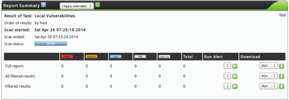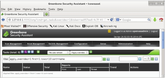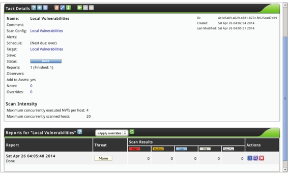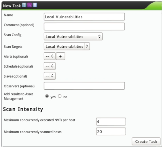 OpenVAS允许用户大范围扫描漏洞,并且将限制在用户的评估列表中。目标主机的漏洞指定是从评估中获得的信息。本小节将介绍使用OpenVAS来扫描用户指定本地目标系统上的漏洞。扫描本地漏洞的具体操作步骤如下所示。