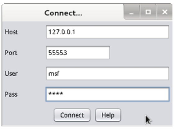 (4)在该界面显示了连接Metasploit服务的基本信息。在该界面单击Connect按钮,将显示如图6.5所示的界面。