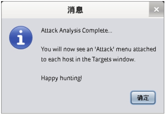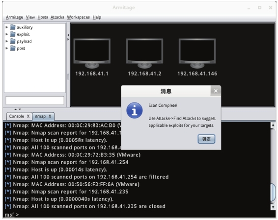 (4)从该界面可以看到,弹出了一个扫描完成对话框,此时单击“确定”按钮即可。并且在目标系统的窗口中,显示了三台主机。这三台主机就是扫描到的主机。从扫描完成的对话框中可以看到提示建议选择Attacks|Find Attacks命令,将可以渗透攻击目标系统。