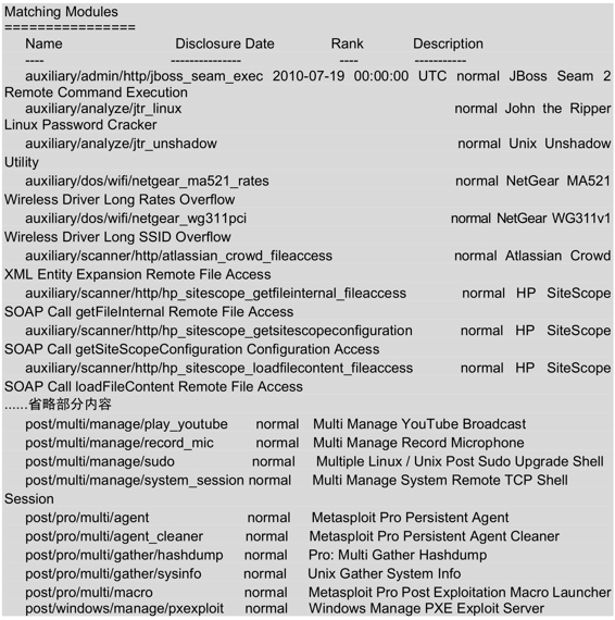 输出的信息就是Metasploit中所有有效的模块。输出的信息显示为4列,分别表示模块名称、公开时间、等级及描述。以上输出的内容较多,但是由于篇幅的原因,这里只列出了一少部分内容,省略的内容使用省略号(……)代替。