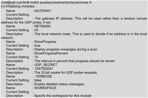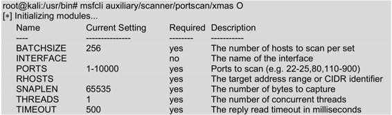 root@kali:/usr/bin# msfcli auxiliary/scanner/portscan/xmas E