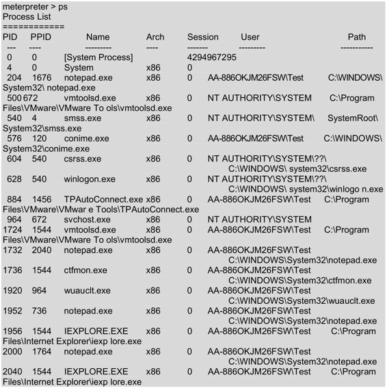 输出的信息显示了漏洞系统中正在运行的所有进程,包括进程的ID号、进程名、系统架构、用户及运行程序的路径等。