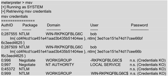 执行以上命令后,输出五列信息。分别表示认证ID、包、域名、用户名和密码。从该界面可以看到,当前系统中bob用户的哈希密码值中。在哈希密码值中,前面的lm表示使用LM方式加密;ntlm表示使用NTLM方式加密。