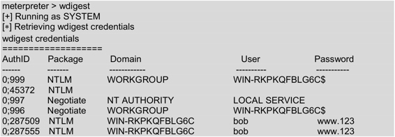 从输出的信息中可以看到,输出的信息类似msv命令输出的信息。唯一不同的就是,这里可以看到使用哈希加密的原始密码。从以上信息中,可以看到bob用户的密码为www.123。