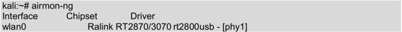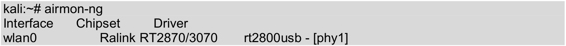 输出的信息显示了无线网卡wlan0的芯片及驱动类型。例如,当前系统的无线网卡芯片为Ralink RT2870/3070;默认驱动为rt2800usb,并显示监听模式被启用,映射网络接口为mon0。