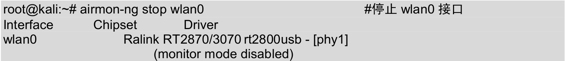 从输出的信息中,可以看到monitor mode enabled on mon0,表示无线网卡已启动监听模式。在以上信息中,还可以看到无线网卡的芯片级驱动类型。其中,该网卡的芯片为Ralink,默认驱动为rt2800usb。