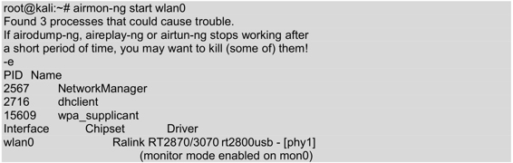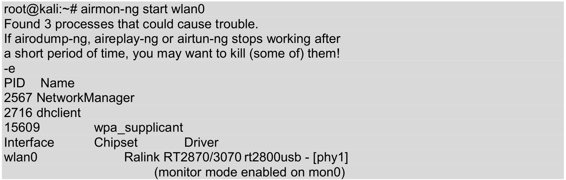 (2)启动无线网卡为监听模式。执行命令如下所示: