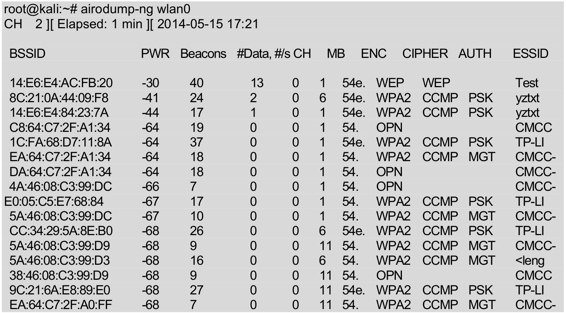 (4)使用airodump命令定位附近所有可用的无线网络。执行命令如下所示:
