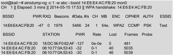 (5)使用airodump-ng捕获指定BSSID的文件。执行命令如下所示。