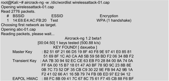 从输出的信息中可以看到无线路由器的密码已经成功破解。在KEY FOUND提示的右侧可以看到密码已被破解出,为daxueba,破解速度约为500.88 k/s。