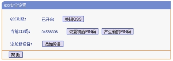 从该界面可以看到QSS功能已开启,可以看到当前的PIN码是04588306。这里可以重新生成新的PIN码,或者恢复初始PIN码。