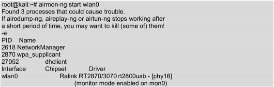 注意:执行以上命令启动监听模式,一定要确定正确识别无线网卡的芯片和驱动。否则,该无线网卡可能导致攻击失败。