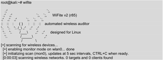 一些破解无线网络程序是使用Aircrack-ng工具集,并添加了一个图形界面或使用文本菜单的形式来破解无线网络。这使得用户使用它们更容易,而且不需要记住任何命令。本节将介绍使用命令行工具Wifite,来扫描并攻击无线网络。