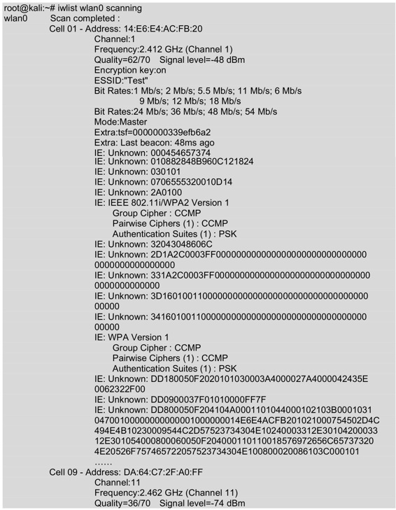 以上输出了的信息显示了无线网卡的相关信息。如网卡MAC地址、信道、加密、速率和模式等。
