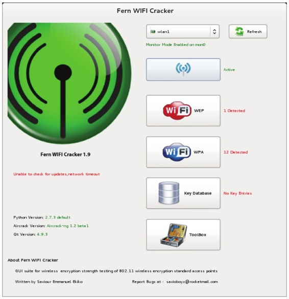 【实例9-5】使用Fern WiFi Cracker工具攻击,在树莓派上攻击WEP和WPA/WPA2无线网络。具体操作步骤如下所示。
