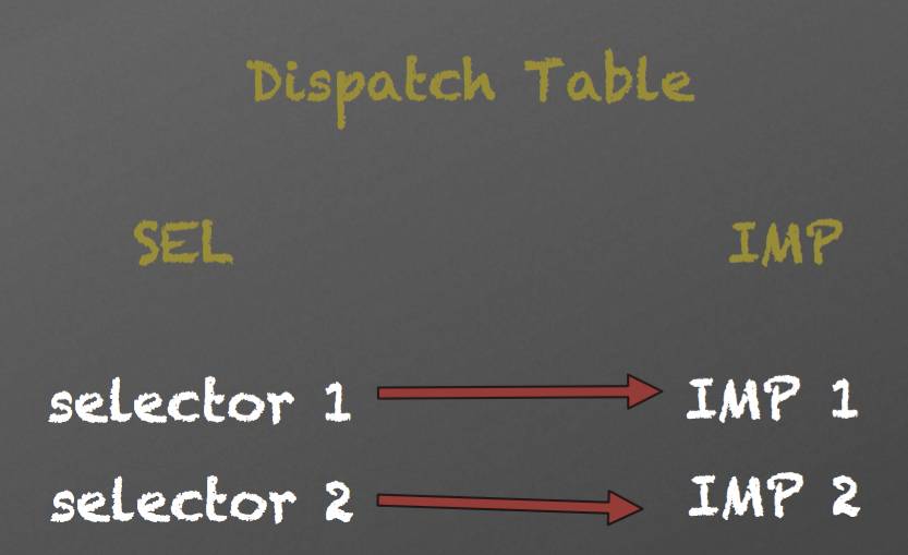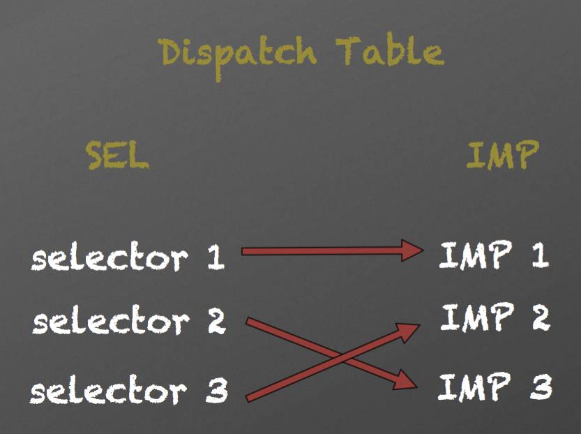 在每个类中都有一个Dispatch Table,这个Dispatch Table本质是将类中的SEL和IMP(可以理解为函数指针)进行对应。而我们的Method Swizzling就是对这个table进行了操作,让SEL对应另一个IMP。