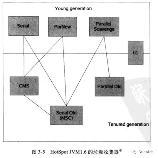 在GC机制中,起重要作用的是垃圾收集器,垃圾收集器是GC的具体实现,Java虚拟机规范中对于垃圾收集器没有任何规定,所以不同厂商实现的垃圾 收集器各不相同,HotSpot 1.6版使用的垃圾收集器如下图(图来源于《深入理解Java虚拟机:JVM高级特效与最佳实现》,图中两个收集器之间有连线,说明它们可以配合使用):