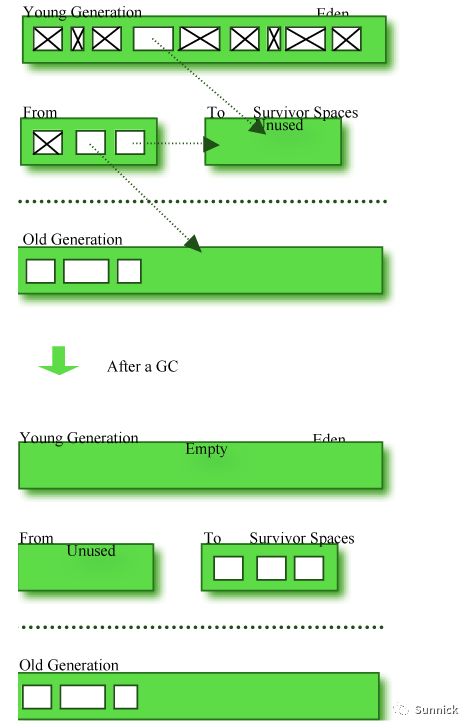 从上面的过程可以看出,Eden区是连续的空间,且Survivor总有一个为空。经过一次GC和复制,一个Survivor中保存着当前还活着的对象,而Eden区和另一个Survivor区的内容都不再需要了,可以直接清空,到下一次GC时,两个Survivor的角色再互换。因此,这种方式分配内存和清理内存的效率都极高,这种垃圾回收的方式就是著名的“停止-复制(Stop-and-copy)”清理法(将Eden区和一个Survivor中仍然存活的对象拷贝到另一个Survivor中),这不代表着停止复制清理法很高效,其实,它也只在这种情况下高效,如果在老年代采用停止复制,则挺悲剧的。