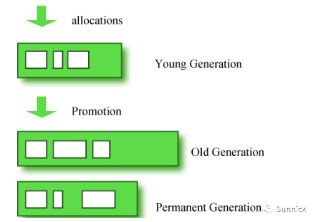 Java内存分配和回收的机制概括的说,就是:分代分配,分代回收。对象将根据存活的时间被分为:年轻代(Young Generation)、年老代(Old Generation)、永久代(Permanent Generation,也就是方法区)。如下图(来源于《成为JavaGC专家part I》,http://www.importnew.com/1993.html):