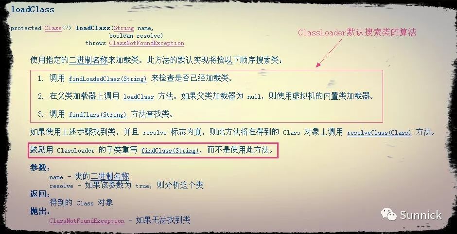 因为JDK已经在loadClass方法中帮我们实现了ClassLoader搜索类的算法,当在loadClass方法中搜索不到类时,loadClass方法就会调用findClass方法来搜索类,所以我们只需重写该方法即可。如没有特殊的要求,一般不建议重写loadClass搜索类的算法。下图是API中ClassLoader的loadClass方法: