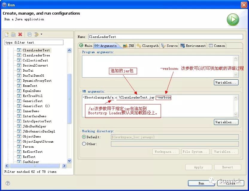 1、在jvm中添加-Xbootclasspath参数,指定Bootstrcp ClassLoader加载类的路径,并追加我们自已的jar(ClassTestLoader.jar)