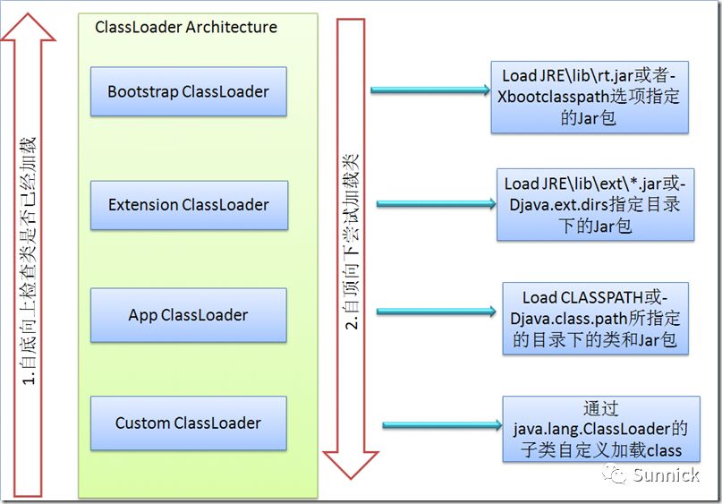 大家都知道,当我们写好一个Java程序之后,不是管是CS还是BS应用,都是由若干个.class文件组织而成的一个完整的Java应用程序,当程序在运行时,即会调用该程序的一个入口函数来调用系统的相关功能,而这些功能都被封装在不同的class文件当中,所以经常要从这个class文件中要调用另外一个class文件中的方法,如果另外一个文件不存在的,则会引发系统异常。而程序在启动的时候,并不会一次性加载程序所要用的所有class文件,而是根据程序的需要,通过Java的类加载机制(ClassLoader)来动态加载某个class文件到内存当中的,从而只有class文件被载入到了内存之后,才能被其它class所引用。所以ClassLoader就是用来动态加载class文件到内存当中用的。