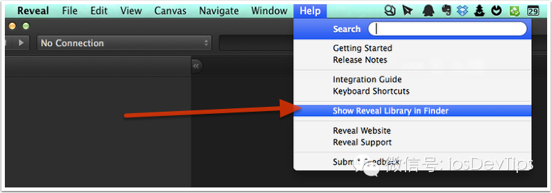点击Reveal菜单栏的”Help”->”Show Reveal Library in Finder”选项(如下图所示),可以在Finder中显示出Reveal的动态链接库:libReveal.dylib