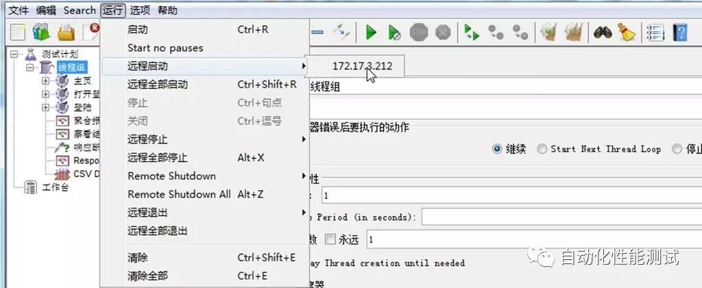 打开client端的JMeter界面,点击运行-远程启动,里面能看到配置好的server端的机器列表。
