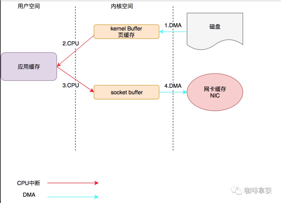 可以看见我们总管需要经历四个阶段,2次DMA,2次CPU中断,总共四次拷贝,有四次上下文切换,并且会占用两次CPU。