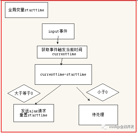 按照上面的描述,咱们来思考一下如何实现上面的代码,首先应该有一个全局变量来获取当前的时间starttime,然后触发input事件的时候,获取触发事件的当前时间currenttime,然后对比两个时间的时间差,如果插值大于等于规定的时间间隔timespace,发送ajax,并且更新starttime,如果小于时间间隔timesapce,不做处理,代码流程图如下: