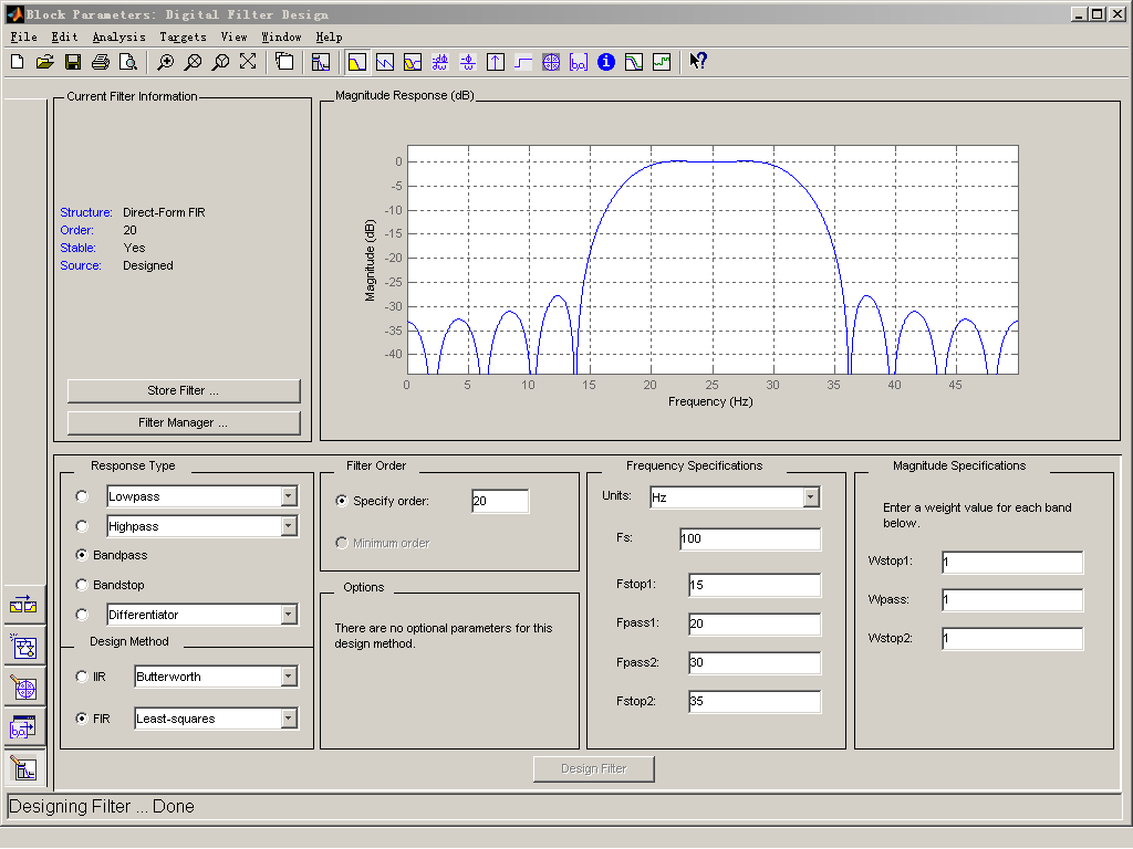 采样频率Fs=100Hz,Fstop1=15HZ,Fpass1=20HZ,Fpass2=30HZ,Fstop2=35HZ。