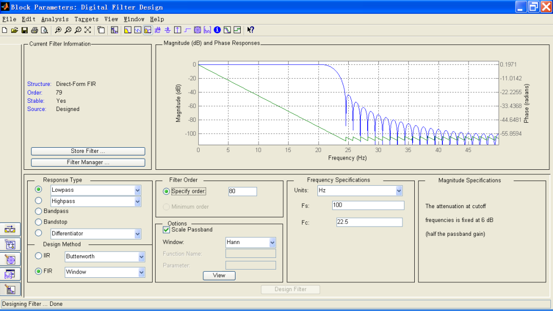 采样频率Fs=100Hz,截止频率Fc=22.5HZ。