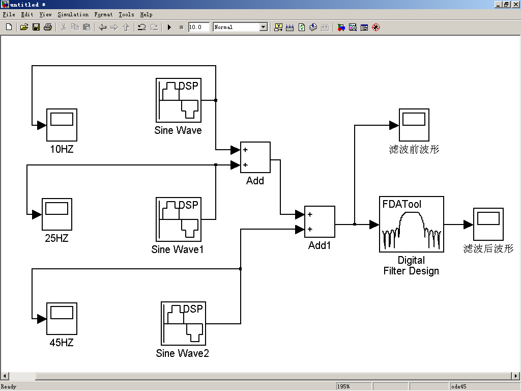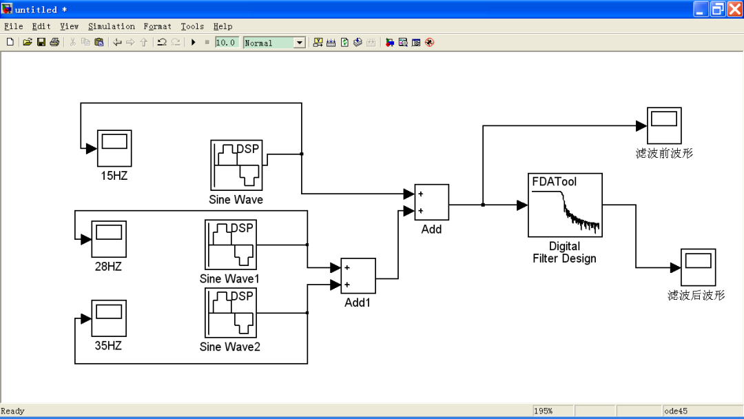 2、用Simulink仿真对窗函数设计的低通滤波器进行滤波: