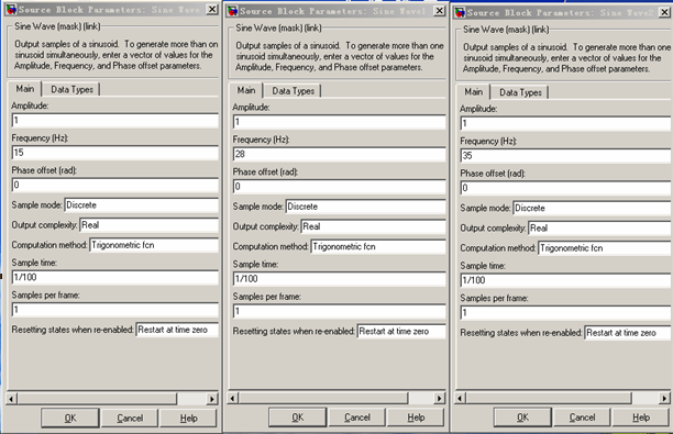 信号源参数设置:三个信号源的频率分别是15Hz、28Hz、35Hz :
