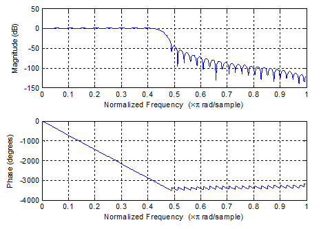 Wp=0.4*pi;Ws=0.5*pi;Wdel=Ws-Wp;N=ceil(8*pi/Wdel);Wn=(0.4+0.5)*pi/2;window=hanning(N+1);b=fir1(N,Wn/pi,window);freqz(b,1,512)