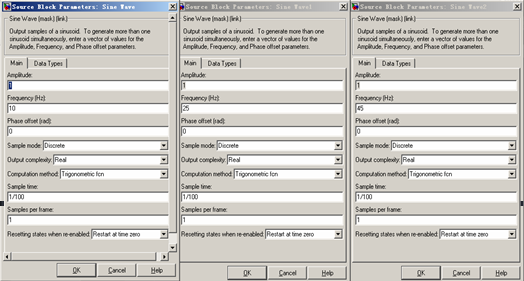 信号源参数设置:三个信号源的频率分别是10Hz、25Hz、45Hz :