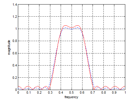 f=[0 0.3 0.4 0.6 0.7 1];m=[0 0 1 1 0 0];n=20;b=firls(n,f,m); %firls函数设计FIR数字滤波器[h,w]=freqz(b);bb=remez(n,f,m); %remez函数设计FIR数字滤波器[hh,w]=freqz(bb);axes('position',[0.2 0.2 0.5 0.5]);plot(w/pi,abs(h),'b:',w/pi,abs(hh),'r-');xlabel('frequency');ylabel('magnitude');grid on;