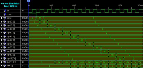 由上图2-12可以看出,tap0到tap10是输入x的依次延时1个时钟周期,结果sum输出相对于输入x延迟了2个时钟周期,y输出相对于sum输出延迟了1个时钟周期,这和程序设计相符合。同时,对比程序运行结果和MATLAB的计算结果(如章节开头表格所示),可知,二者结果是一致的,其中个别数据的小误差是由于移位取代小数乘法运算带来的误差。因此,程序设计是正确的。