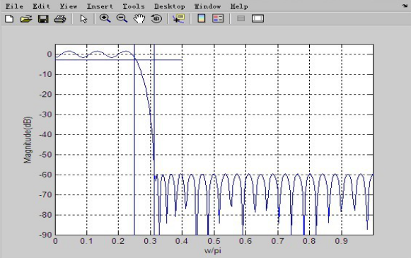 clear;close allfc=1/4;fs=5/16; %输入给定指标Rp=3;As=60;Fs=2;f=[fc,fs];m=[1,0]; %计算remezord函数所需参数f,m,devdev=[(10^(Rp/20)-1)/(10^(Rp/20)+1),10^(-As/20)];[N,fo,mo,W]=remezord(f,m,dev,Fs); %确定remez函数所需参数hn=remez(N,fo,mo,W); %调用remez函数进行设计hw=fft(hn,512); %求设计出的滤波器频率特性w=[0:511] *2/512;plot(w,20*log10(abs(hw)));grid; %画对数幅频特性图axis([0,max(w)/2,-90,5]);xlabel('w/pi');ylabel('Magnitude(dB)')line([0,0.4],[-3,-3]); %画线检验设计结果line([1/4,1/4],[-90,5]);line([5/16,5/16],[-90,5]);