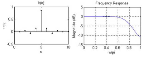图2-11 11阶FIR滤波器的抽头系数和幅频特性曲线