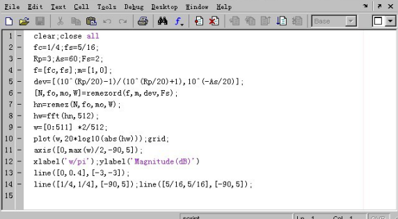 有了这几个参数我们现在就可以根据已经设定好的格式来调用函数remezord和remez函数了,于是可得如下程序。