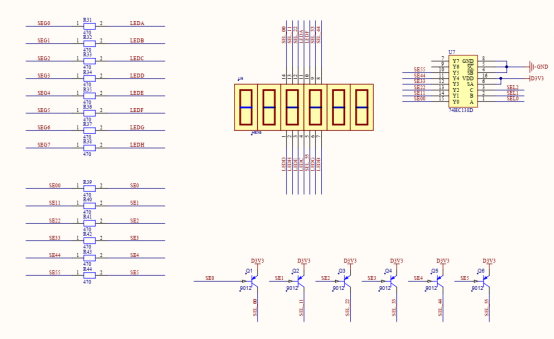 数码管共有八个段选信号,通过电阻直接与FPGA相连接;有六个供电端,分别三极管相连接,三极管的控制端由三八译码器的输出控制,三八译码器的输入是由FPGA控制输出。