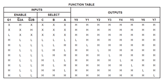 三八译码器的原理为C、B、A组成输入信号,根据C、B、A的输入值,对应选择Y(低电平选中)。