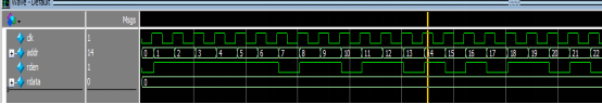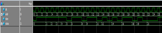 在波形中可以看到,当rden为高时,rdata能够延迟两拍后,输出对应的数据(当地址为1、2、3时)。当rden为低时,rdata保持上一个值不变(当地址为7时)。其他地址设计者可以自动对应。