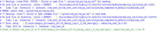 出现此种错误的原因为,modelsim和quartus的有很多文件在进行关联是都是使用相对路径,为的是方便工程的移植。而在仿真时,两个modelsim软件认为的基本路径和quartus软件认为的基本路径不相同,所以导致出此错误。此时,笔者建议大家直接打开ipcore -> rom_my -> rom_my.v,进行修改初始化文件,将相对路径直接修改为绝对路径。