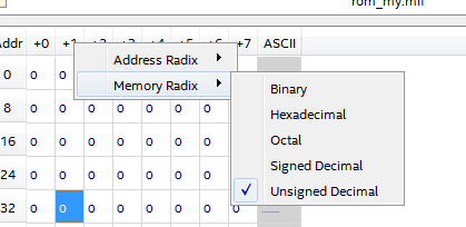 在基地址或者偏移地址上,右击可以更改地址的进制和存储空间存储数据的进制。